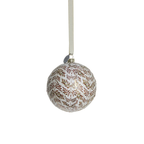 Denna vackra Hilde tillför naturlig elegans till festliga dekorationer med sin delikata botaniska design. Den mjuka, dämpade basen är prydd med fina mörkröd blad och subtila gulddetaljer, vilket skapar ett tidlöst och sofistikerat uttryck. Med en matt papperfinish som framhäver dess vintage charm, utstrålar denna värme och raffinemang. Julkulan är ett vackert tillskott till alla dekorationer och firar naturens skönhet på ett klassiskt och subtilt sätt.Produkt: dekoration